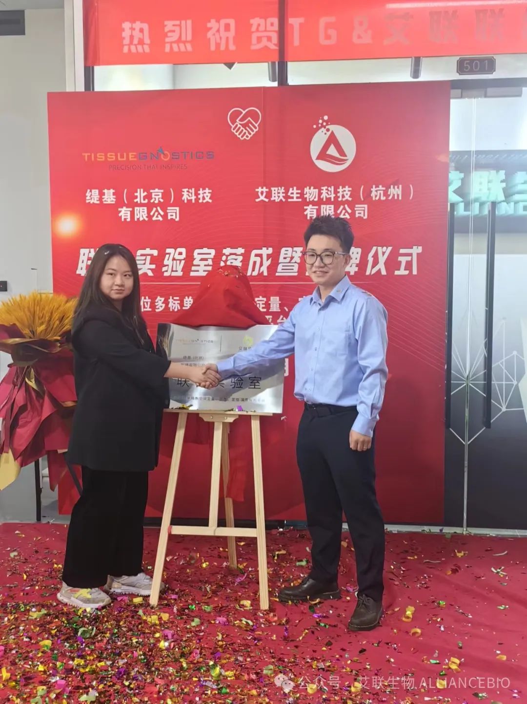 艾联生物总经理涂小蝶及TissueGnostics公司市场部方霖,分别作为双方公司代表,为「TissueGnostics&艾联生物联合实验室」揭牌并合影留念。
