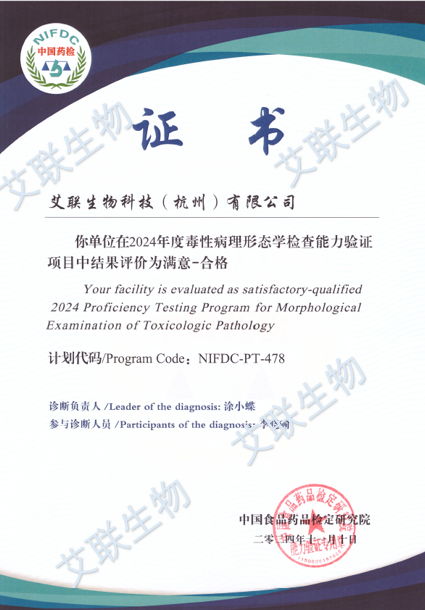 中检院安评所按照实验室认可有关要求,首次开展2024年度毒性病理形态学检查能力验证及测量审核活动。此次活动通过毒性病理实验室能力验证的方式:来评估各安评及相关机构的毒性病理学诊断水平;通过对能力验证结果的分析、答疑及再培训,提高各实验室的病理诊断及综合评价能力;提高药物非临床安全性评价质量,促进我国新药研发,以及保障安全用药。此次比对活动吸引各级检验检测机构、从事药物非临床安全性评价研究实验室、涉及病理学研究的相关机构踊跃参加,艾联生物获得此次比对活动的满意成绩证书。