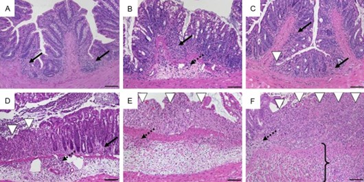 去除DSS后第2天,C57BL/6野生型小鼠中DSS诱导的结肠炎中结肠组织的组织形态学。A.总评分1:轻度粘膜炎性细胞浸润(评分1:1),上皮完整(评分2:0);B。总评分2:炎症细胞浸润到粘膜和粘膜下层(评分1:2),上皮未受损(评分2:0);C。总评分3:粘膜浸润(评分1:1)伴有局灶性溃疡(评分2:2);D。总分4分:粘膜和粘膜下炎症细胞浸润(1:2分)和局灶性溃疡(2:2分);E。总分5:中度炎性细胞浸润至粘膜和粘膜下层(得分1:2),伴有广泛溃疡(得分2:3);F。总评分6:透壁性炎症(评分1:3)和广泛溃疡(评分2:3)。原图放大倍数×100;比例尺100µm;箭头-粘膜(实线)和粘膜下层(虚线)内有炎性细胞浸润;白箭头状溃疡;括弧–透壁性炎症。
