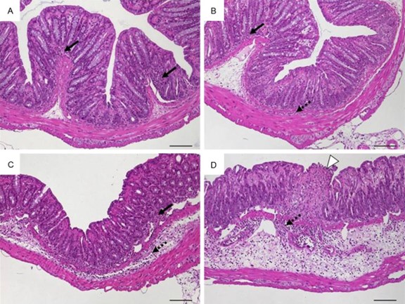直肠内应用卵清蛋白和同时静脉内转移卵清蛋白特异性T细胞后6周结肠组织的组织形态学。为野生型小鼠。A。评分1:粘膜中具有最小局灶性炎性细胞浸润的完整上皮;B。评分2:黏膜及黏膜下层有散在炎性细胞浸润;C。评分3:弥漫性粘膜和粘膜下炎性细胞浸润;D。评分4:粘膜下层中度炎性细胞浸润,水肿,局灶性溃疡。原图放大倍数×100;比例尺100µm;箭头-粘膜(实线)和粘膜下层(虚线)内有炎性细胞浸润;白箭头状溃疡。