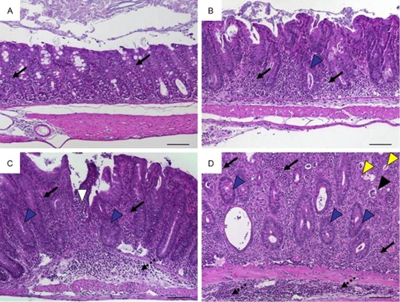 4月龄的IL-10 KO小鼠结肠组织的组织形态学。A。评分1:在具有完整上皮的粘膜中有最小的炎性细胞浸润;B。评分2:粘膜轻度炎性细胞浸润,伴轻度增生和轻度杯状细胞丢失;C。评分3:粘膜和粘膜下层中度炎性细胞浸润,伴中度杯状细胞丢失;D。评分4:粘膜和粘膜下层有明显的炎性细胞浸润,伴有明显的增生和明显的杯状细胞丢失。多发性隐窝脓肿和隐窝缺失。原图放大倍数×100;比例尺100µm;箭头-粘膜(实线)和粘膜下层(虚线)内有炎性细胞浸润;黑箭头隐窝脓肿;黄色箭头-隐窝损失;蓝色箭头-杯状细胞丢失。