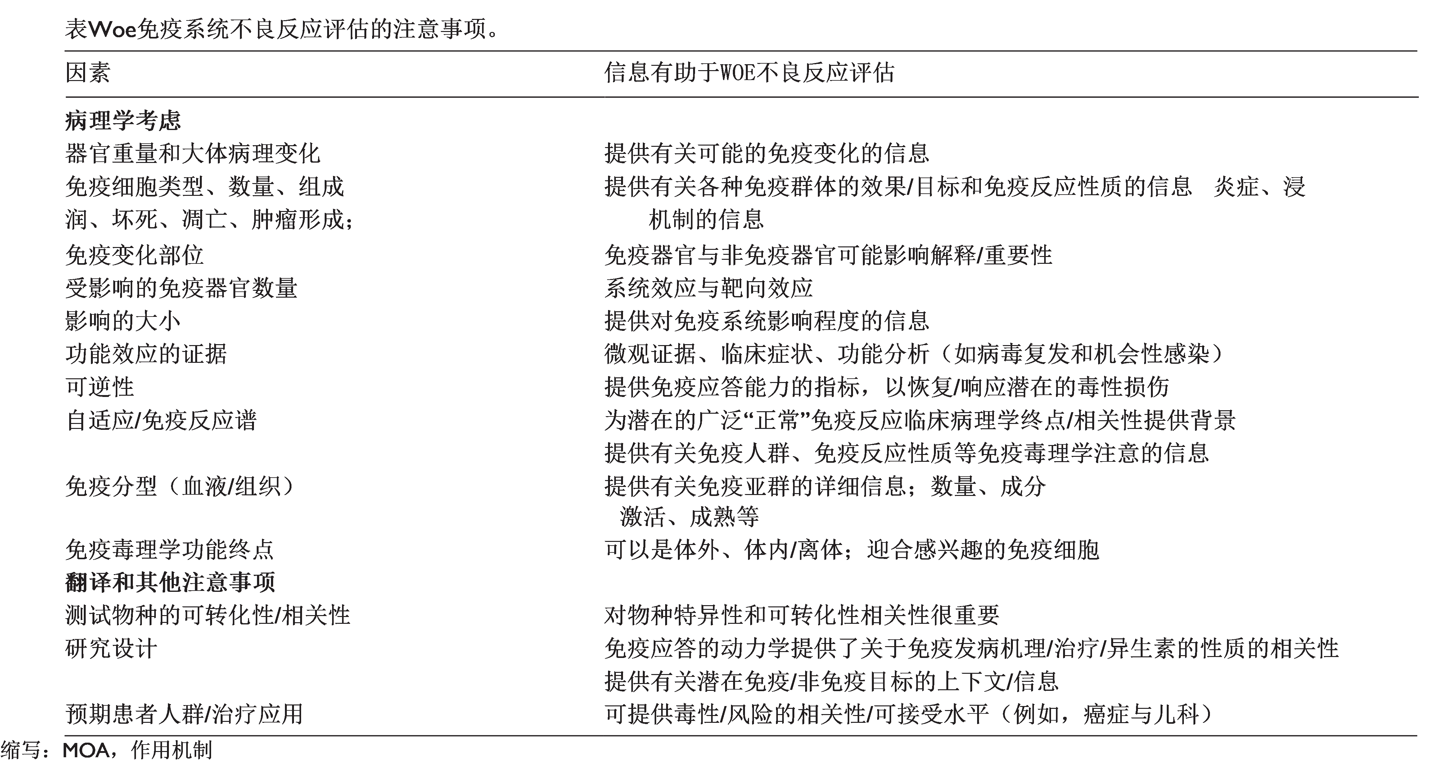 对于免疫系统,在确定不良反应时,最好对所有组织的免疫变化进行综合评估,而不是对单个组织的免疫变化进行综合评估,了解什么构成伤害(以及不良反应)可能需要考虑免疫学、病理学和毒理学因素以及相关数据点。我们认为,免疫结果的不良反应确定应保持灵活性,与环境相关,并结合WOE方法,理想情况下与大量/选定的免疫毒理学相关结果,包括来自单独阶段报告的任何可用的补充数据集。监管机构,以及那些参与药物开发的机构,依靠WOE方法来评估风险,并考虑风险评估策略的许多重要事项。为任何治疗剂开发WOE都是针对该治疗剂的,并且需要在已发表的文献、靶生物学、药代动力学、类别效应、可转化性和临床专业知识的背景下对非临床研究结果进行评估和解释。表4列出了一些病理,免疫毒理学和转化因素通常被纳入制定疾病评估和免疫系统不良反应评估。