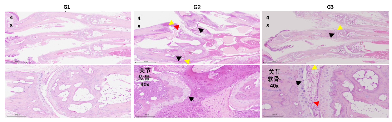 G2:关节滑膜增生,新生血管增生形成血管翳(黄色→),淋巴细胞和巨噬细胞增生(红色→) ;